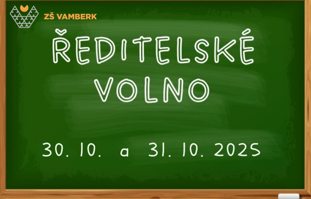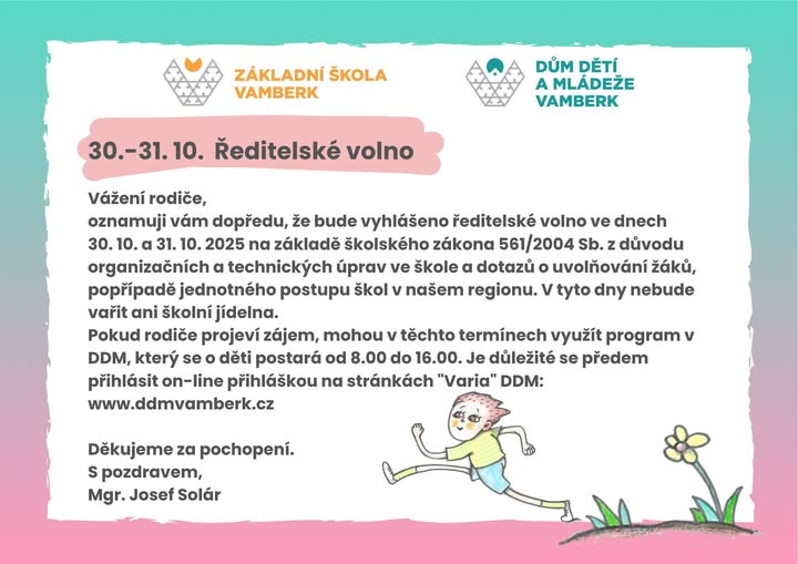 oznamuji vám dopředu, že bude vyhlášeno ředitelské volno ve dnech 30. 10. a 31. 10. 2025 na základě školského zákona 561/2004 Sb. z důvodu organizačních a technických úprav ve škole a dotazů o uvolňování žáků, popřípadě jednotného postupu škol v našem regionu. V tyto dny nebude vařit ani školní jídelna.