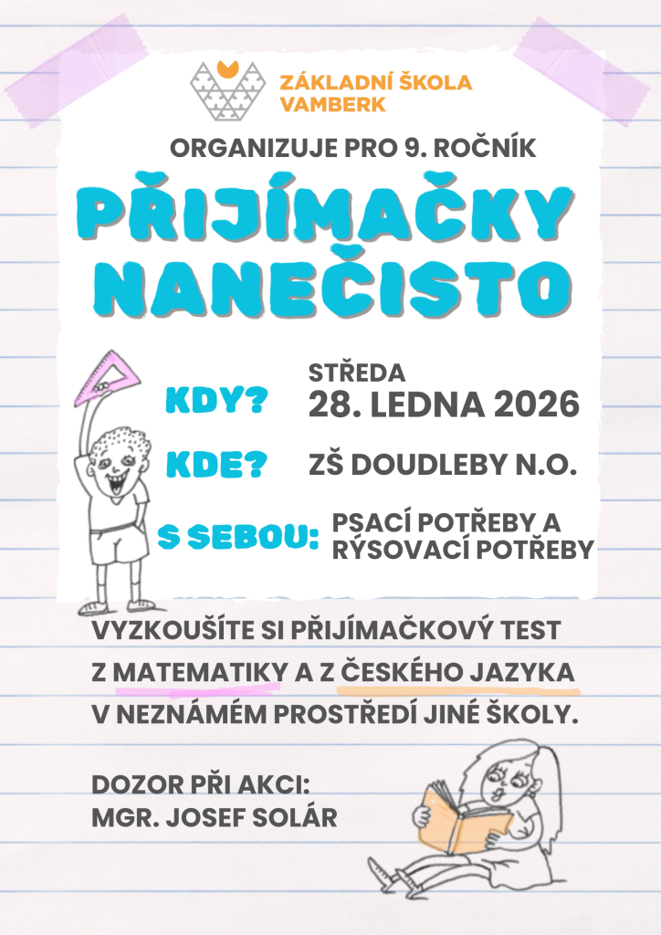 Naše škola připravila pro žáky přijímačky nanečisto, které proběhnou 28. 1. 2026. V rámci spolupráce se ZŠ Doudleby nad Orlicí se žáci obou škol prohodí – naši žáci pojedou do ZŠ Doudleby a žáci z Doudleb absolvují přijímačky u nás.