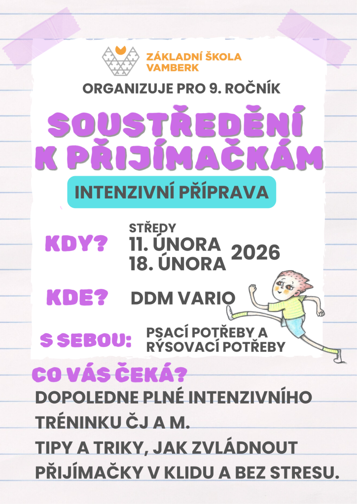 V letošním roce chceme našim deváťákům poskytnout maximální podporu při přípravě na přijímací zkoušky. Proto jsme pro ně připravili intenzivní přípravné kurzy, které proběhnou ve středu 11. 2. 2026 a ve středu 18. 2. 2026 v dopoledních hodinách.