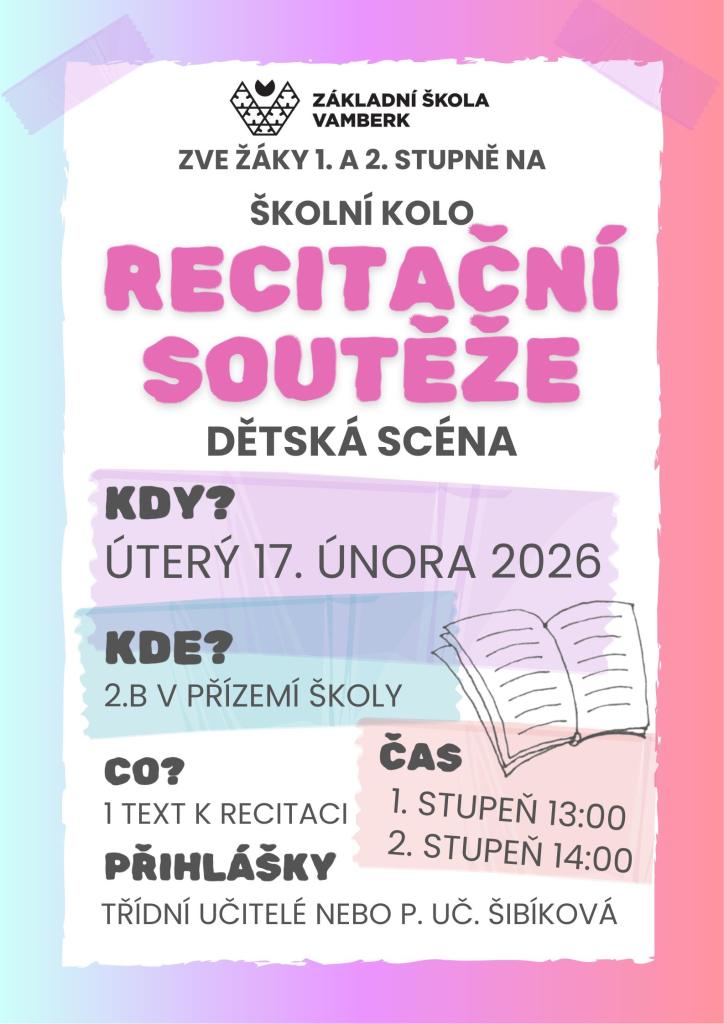 Naše škola pořádá v úterý 17. února 2026 školní kolo tradiční recitační soutěže, která je určena dětským sólovým recitátorům a dlouhodobě se řadí mezi nejvýznamnější přehlídky uměleckého přednesu v rámci základních škol. Soutěž rozvíjí u žáků schopnost interpretovat literární text, podporuje kultivaci mluveného projevu a pomáhá dětem lépe porozumět obsahu básní či prozaických ukázek.