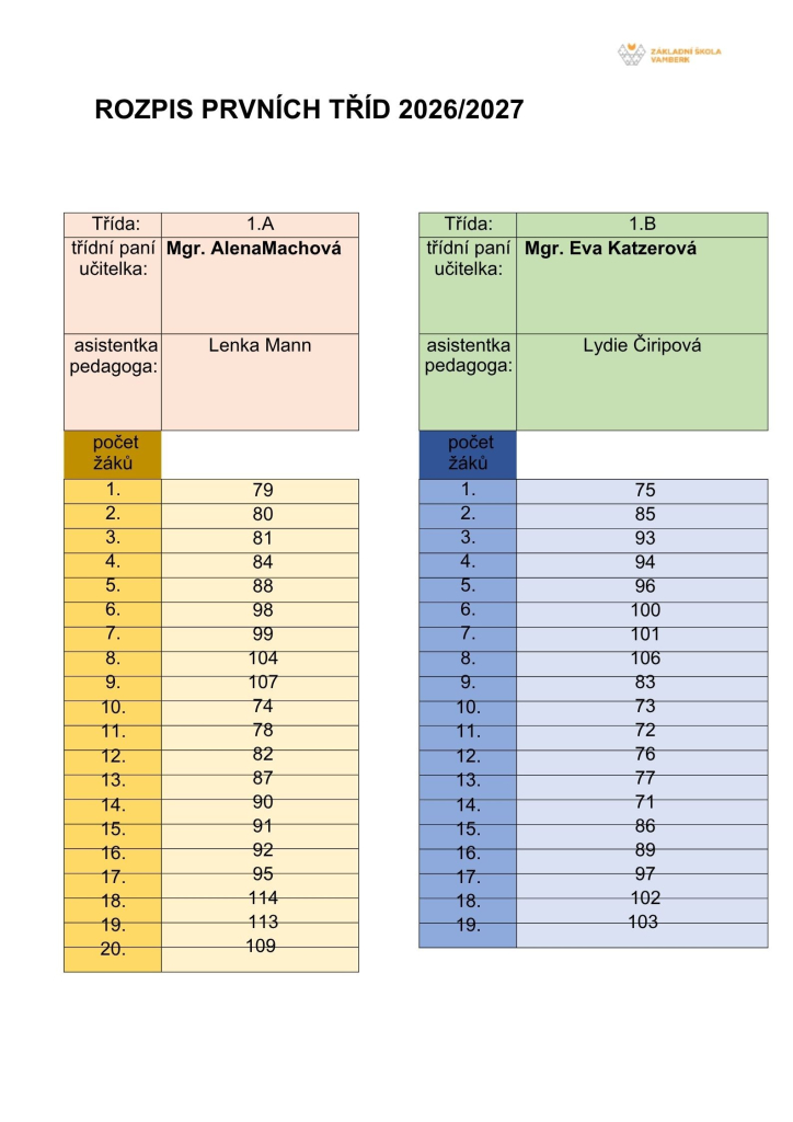 Současně škola informuje zákonné zástupce o rozdělení přijatých žáků do jednotlivých 1. tříd: