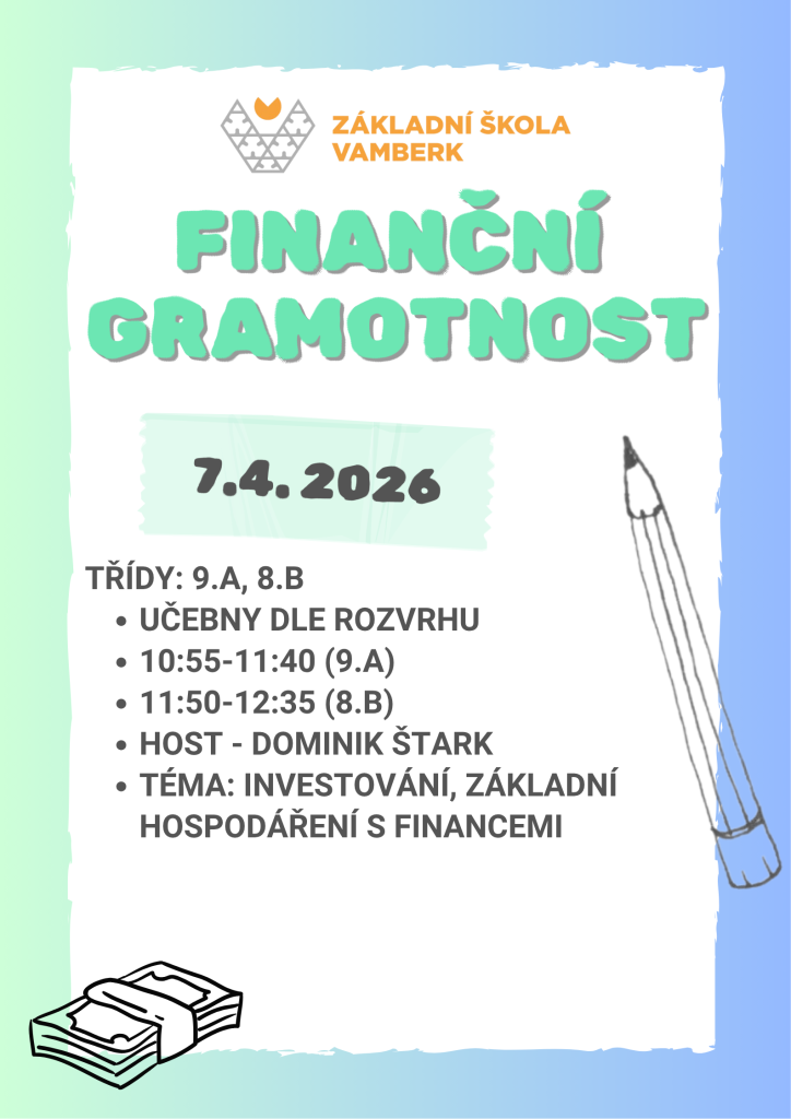 Naše škola klade dlouhodobě velký důraz na rozvoj finanční gramotnosti žáků, protože považujeme tuto dovednost za nezbytnou součást moderního vzdělávání. Chceme, aby naši žáci uměli zodpovědně hospodařit s penězi, rozuměli základním ekonomickým pojmům a dokázali se orientovat v situacích, které je v běžném životě čekají. Proto jsme pro ně uspořádali odbornou přednášku, která jim přiblíží principy osobních financí i praktické příklady z každodenní praxe. Žáci se během ní dozvědí například to, jak funguje rozpočet domácnosti, proč je důležité vytvářet rezervy nebo jak se vyhnout nejčastějším finančním nástrahám. Věříme, že získané poznatky jim pomohou stát se sebevědomějšími a odpovědnějšími v oblasti finančních rozhodnutí.