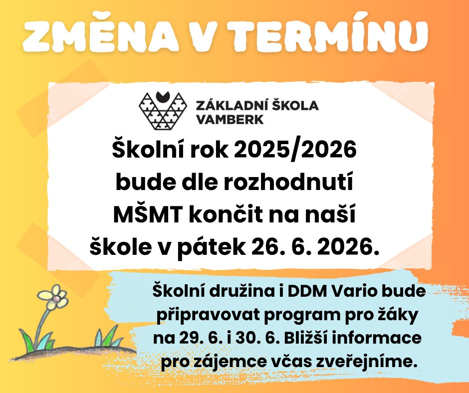 Včera ministerstvo oznámilo změnu termínu konce školního roku 2025/2026. Reagujeme tedy i my. Budeme končit v pátek 26. 6.! A v 29. 6. a 30. 6. nabídneme zájemcům možnost využít program ve školní družině či DDM Vario. Bližší informace včas zveřejníme.