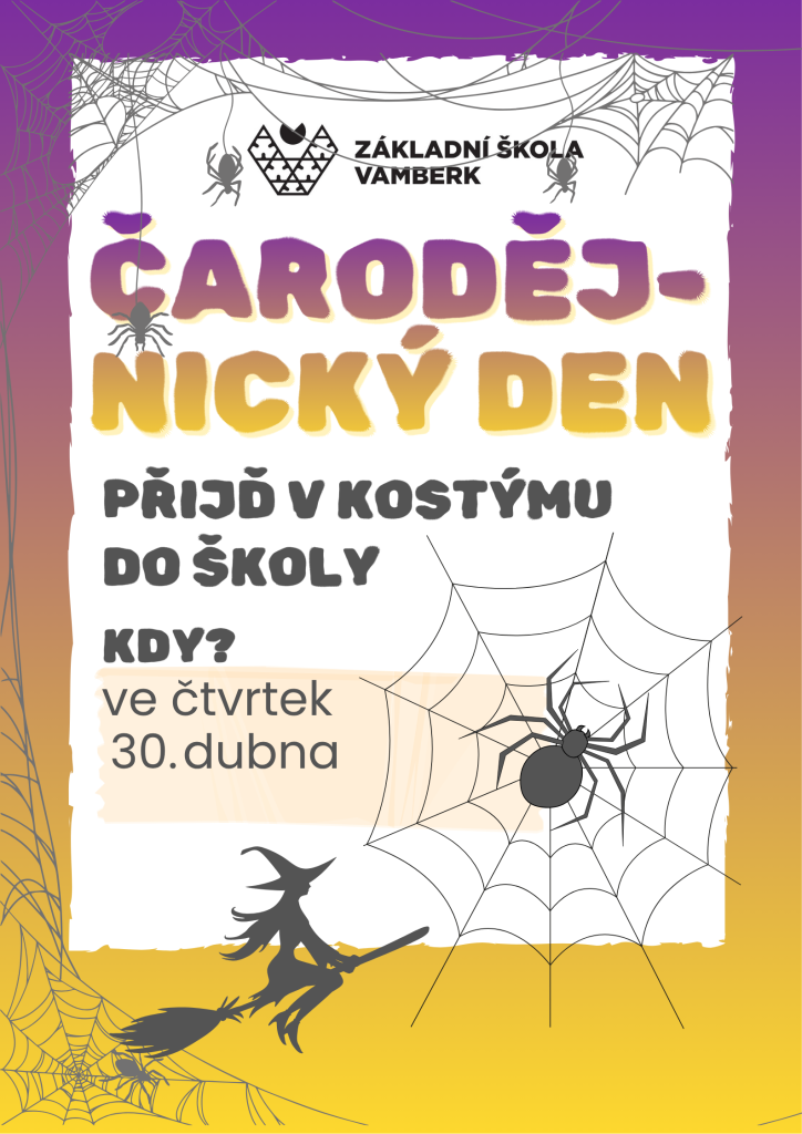 Poslední dubnové dny patří v Česku čarodějnicím, kouzlům a dobré náladě – a ani naše škola nezůstane pozadu! V tento den mohou žáci přijít do školy v kostýmech čarodějů a čarodějek všeho druhu. Fantazii se meze nekladou, povoleny jsou klobouky, pláště, kočky na rameni (plyšové!) i tajemné bradavice. Košťata jsou vítána, pokud se vejdou do školních skříněk a neblokují únikové východy. Létání po chodbách je povoleno pouze v představách.